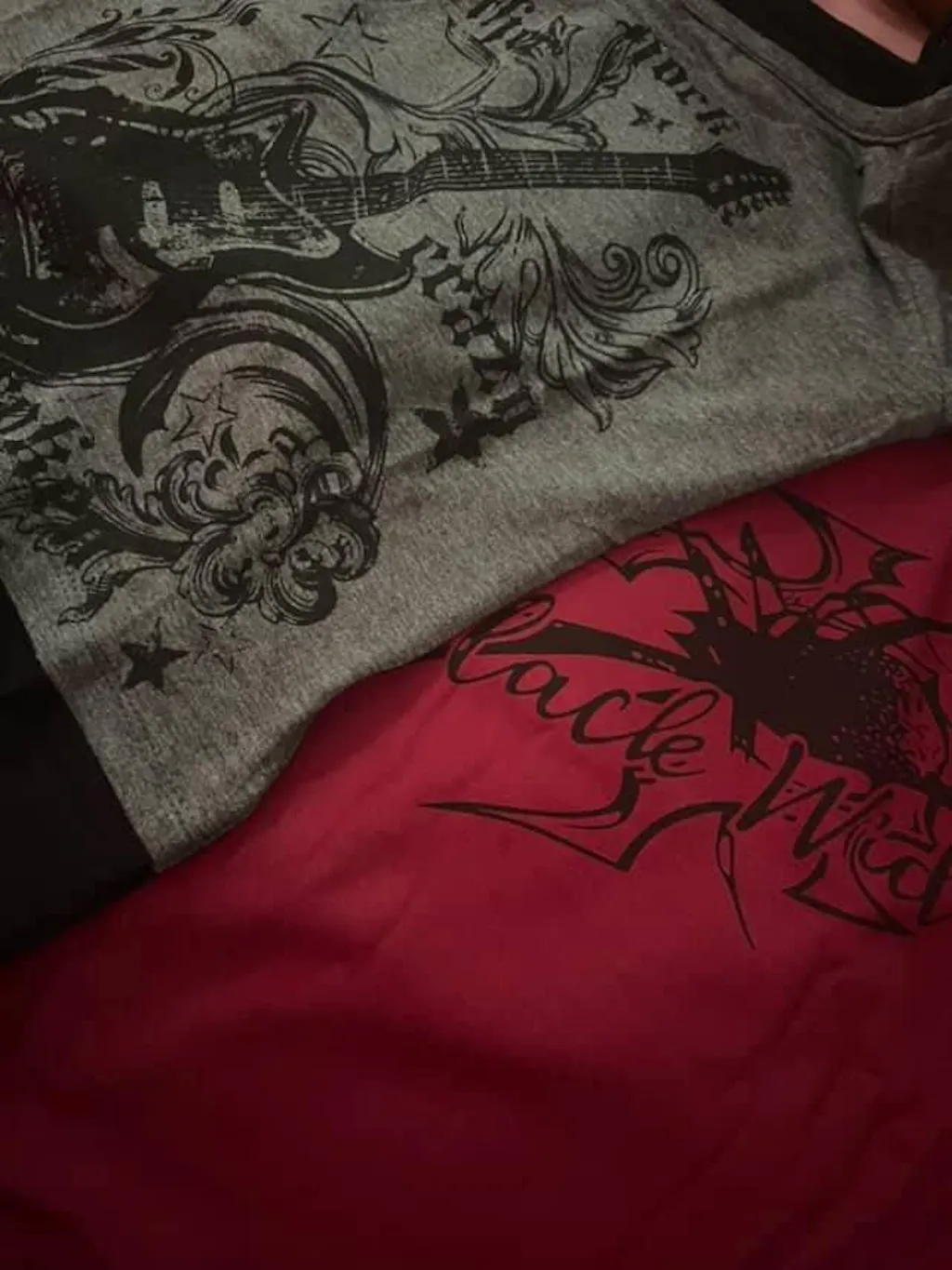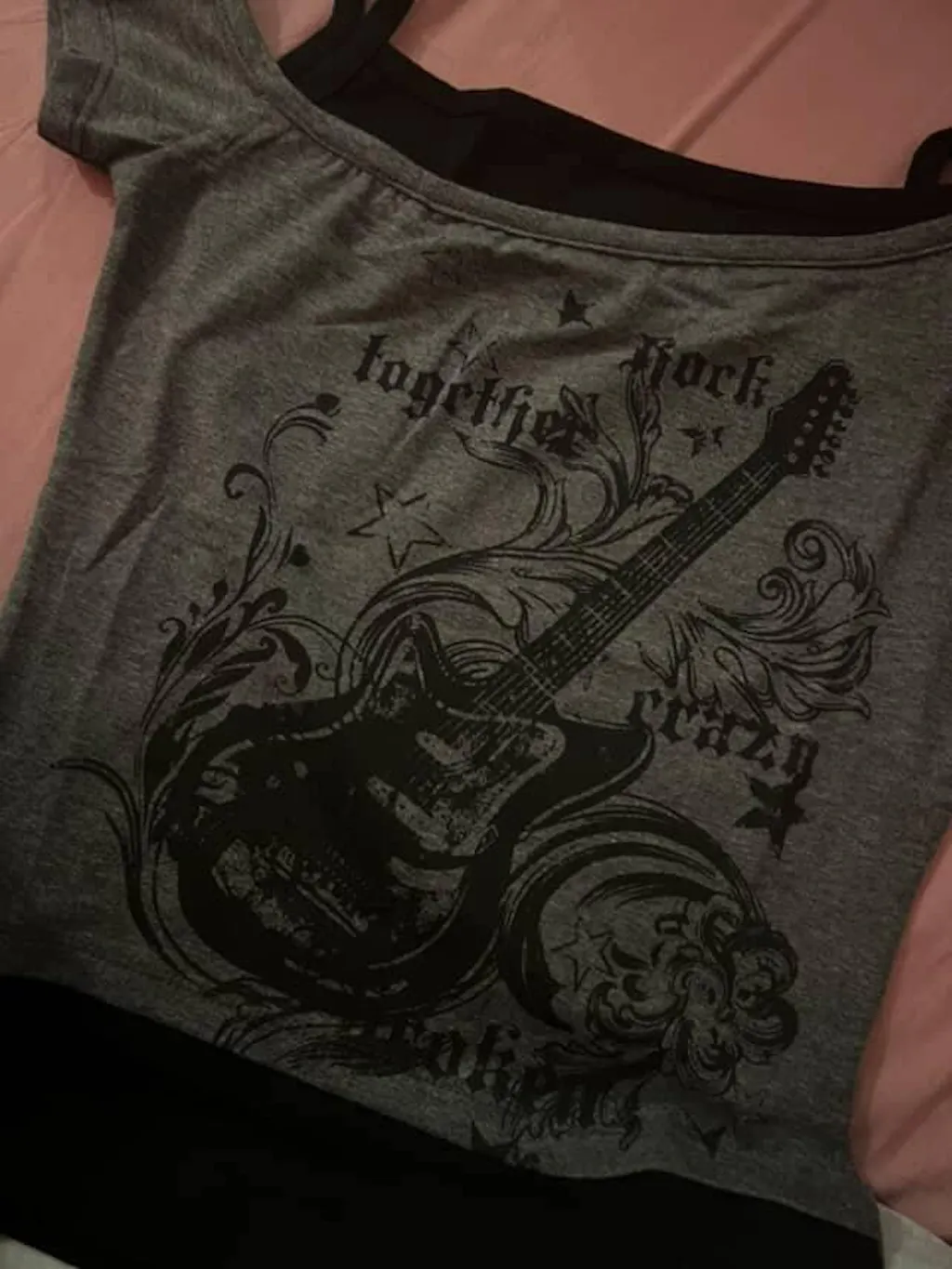 توب نسائي عصري بتصميم طبقتين، يحتوي على توب أسود بحمالات رفيعة تحت طبقة رمادية قصيرة الأكمام تكشف الأكتاف. يتميز بطبعة غرافيكية لغيتار كهربائي محاط بنجوم ونقوش تجريدية بنمط متآكل، ما يمنحه طابع روك وغرنچ وY2K. القماش مضلع قليلاً وقد يحتوي على لمعة خفيفة. مثالي للإطلالات الجريئة في الكاجوال، الحفلات أو المهرجانات
