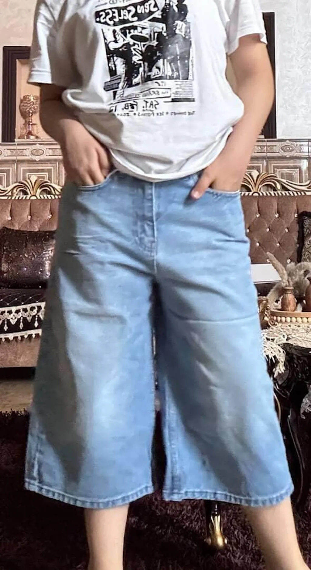 شورت باغي جينز بلون أزرق ثلجي فاتح، تصميم مريح وعصري بطول يقارب 68 سم، مثالي للأيام الصيفية