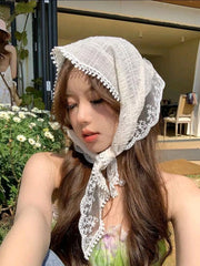 وشاح رأس نسائي شفاف وخفيف مصنوع من قماش أبيض ناعم مزخرف بحواف دانتيل زهرية فاخرة. يُربط تحت الذقن أو خلف الرقبة ليمنح إطلالة حالمة بنمط كوتيجكور أو فيريكور. مثالي للمناسبات الصيفية، النزهات، أو لإضافة لمسة أنثوية ساحرة للمظهر اليومي